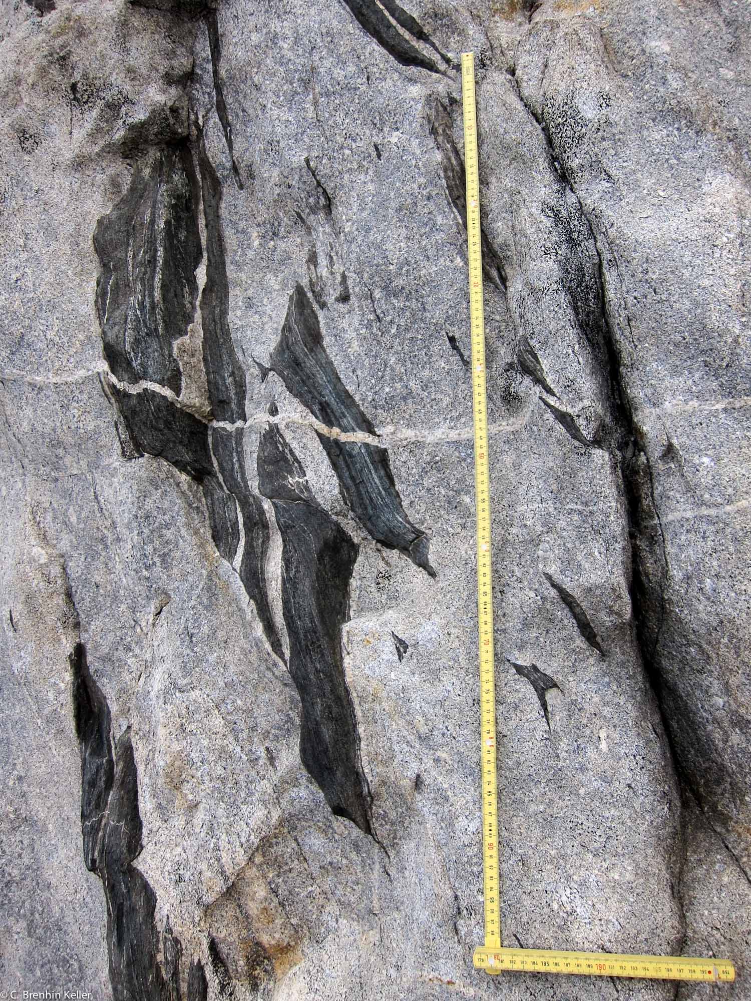 Mafic enclave diced by two small magmatic shear zones, Sciora region