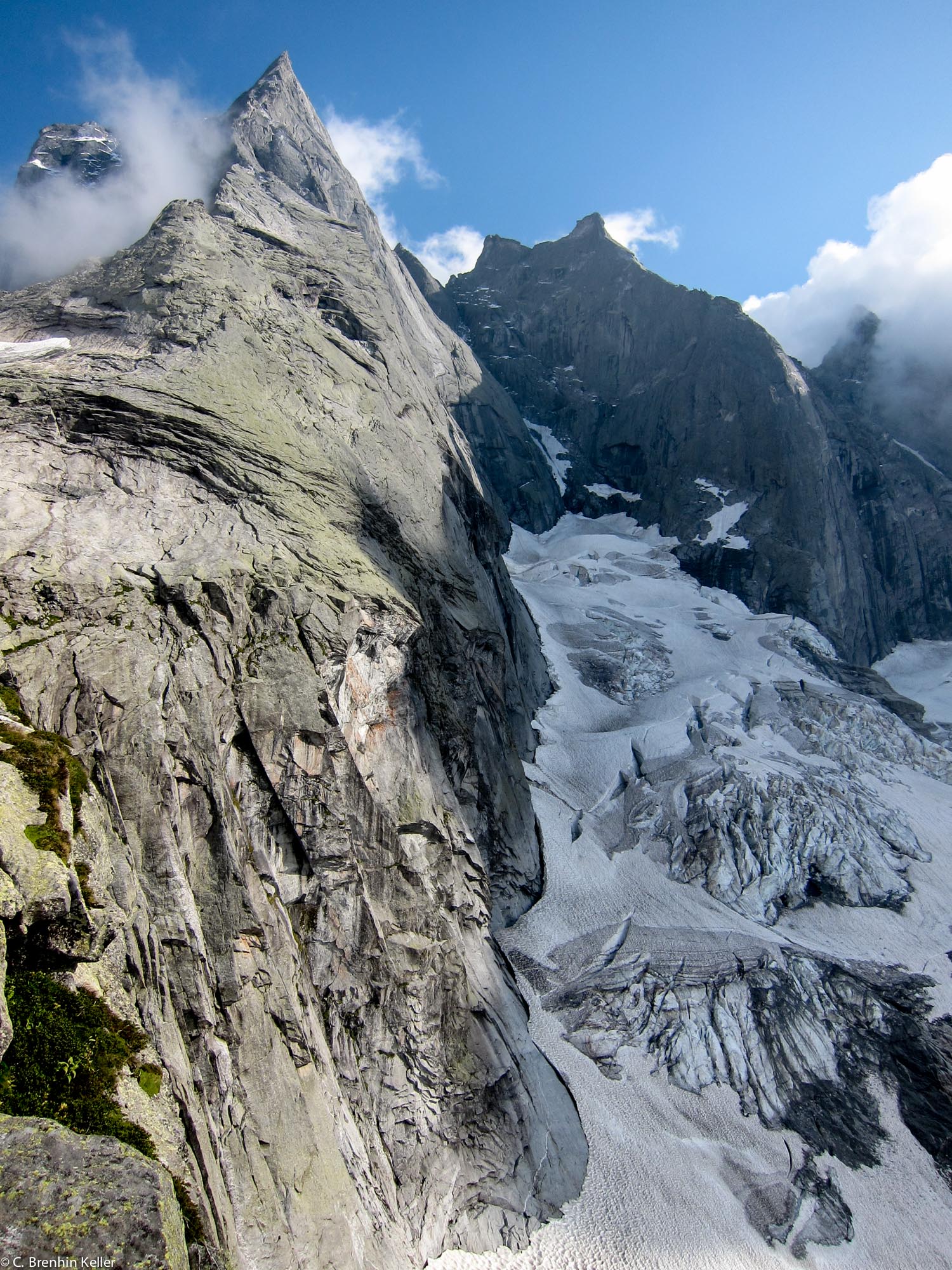 The spire of Piz. Badile, glacially carved out of Bergell granodiorite, Sciora region