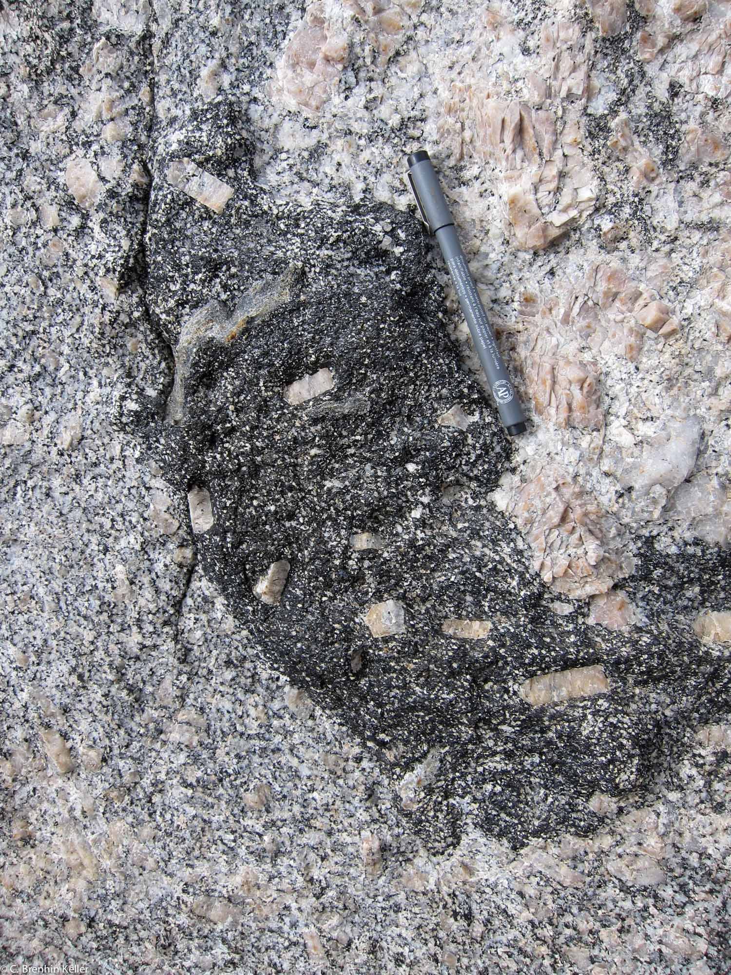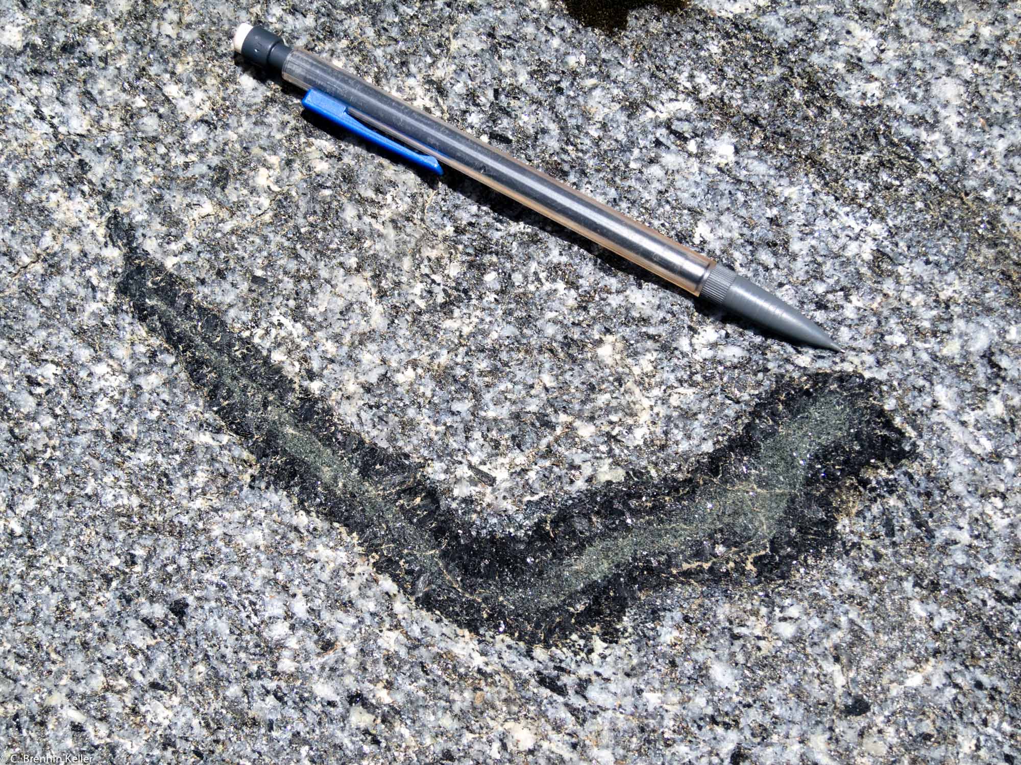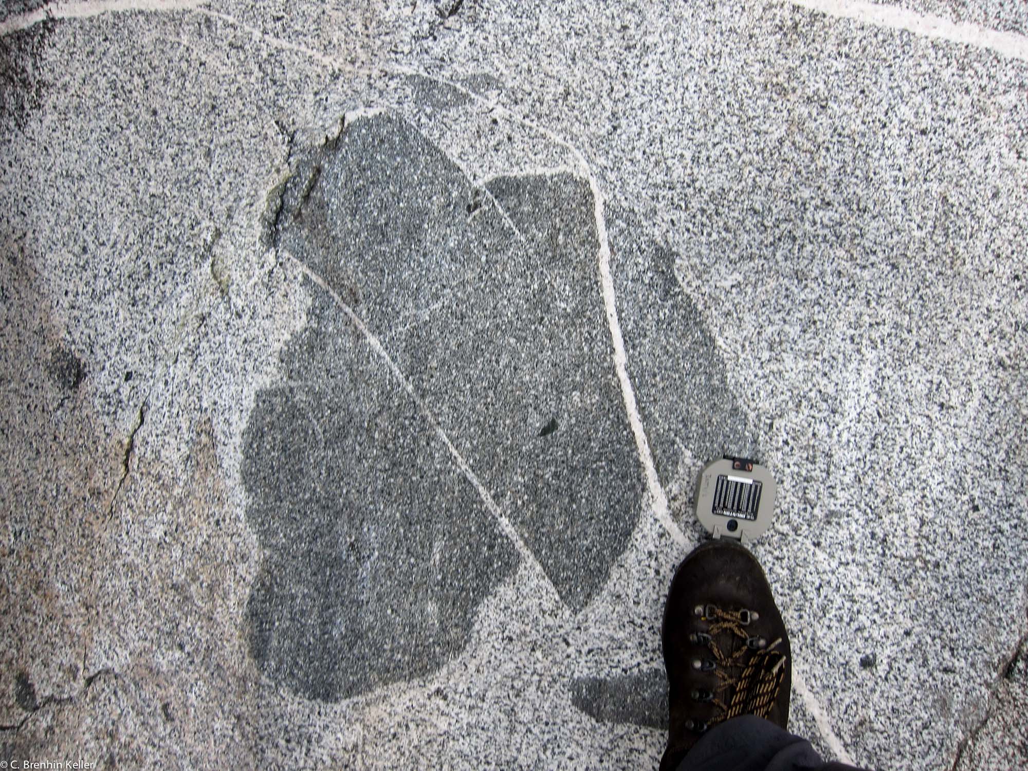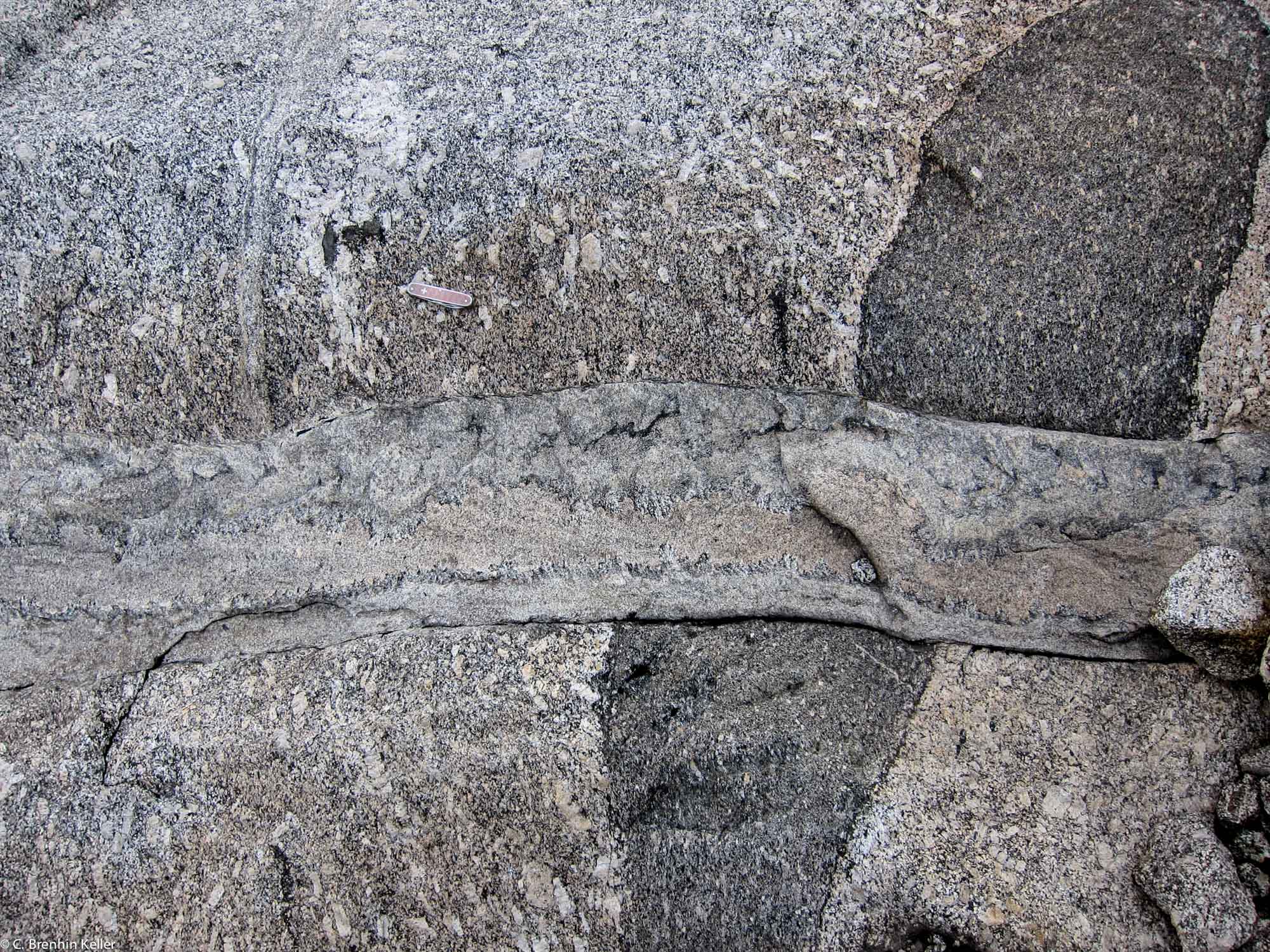 A large mafic enclave cut and offset by an aplite dike, Sciora region