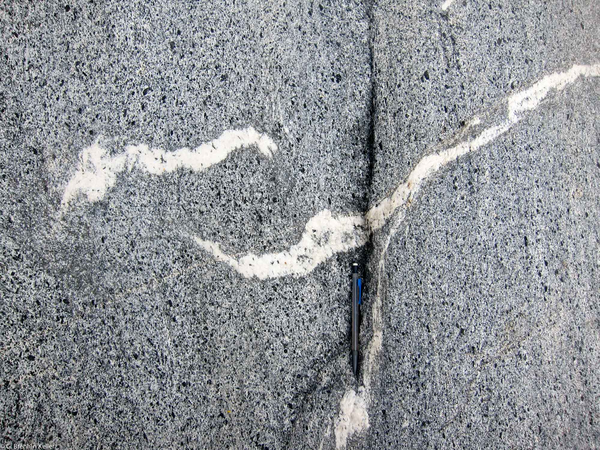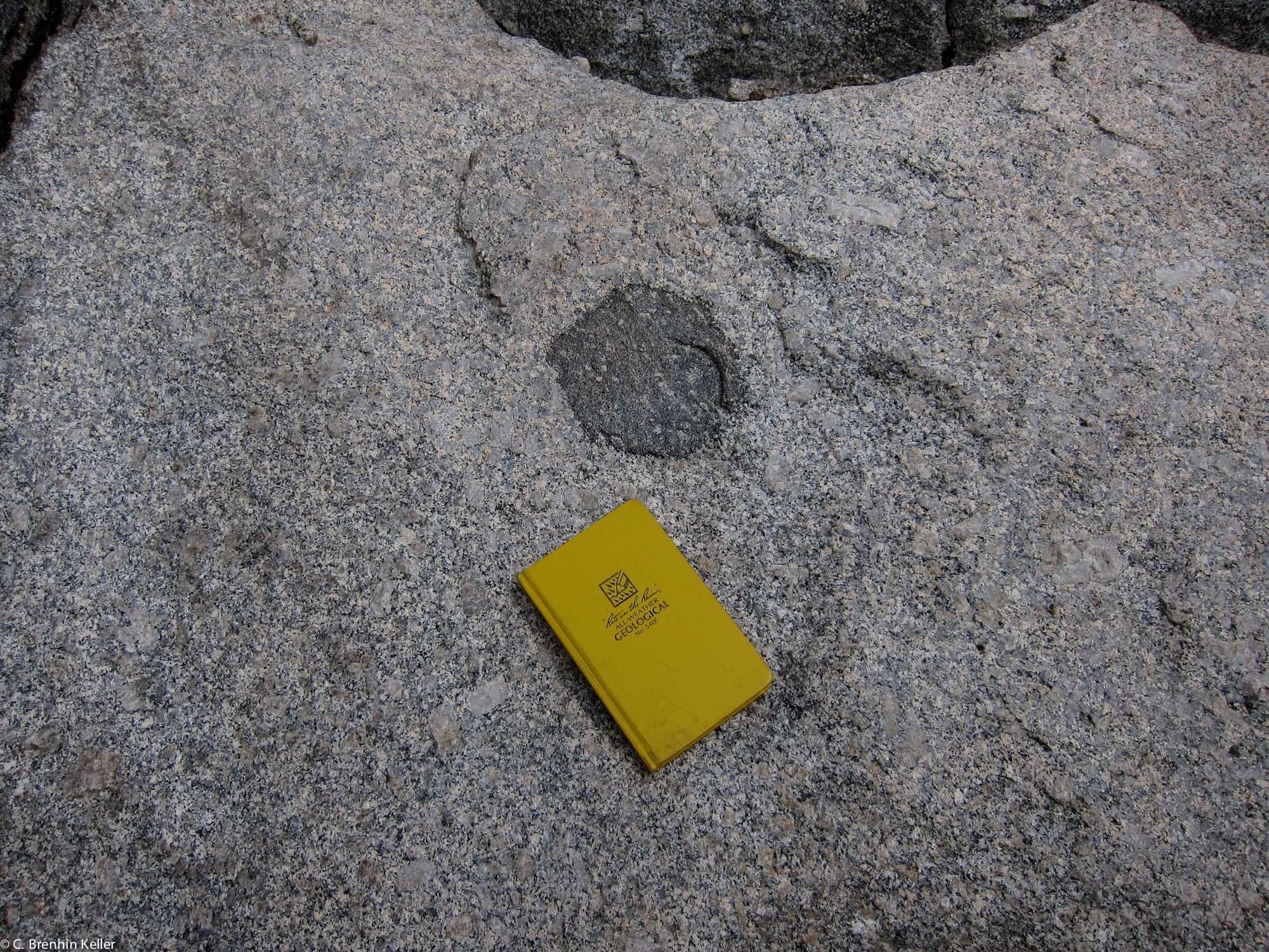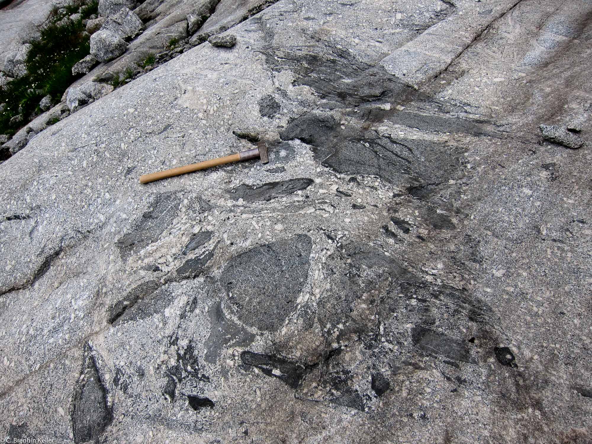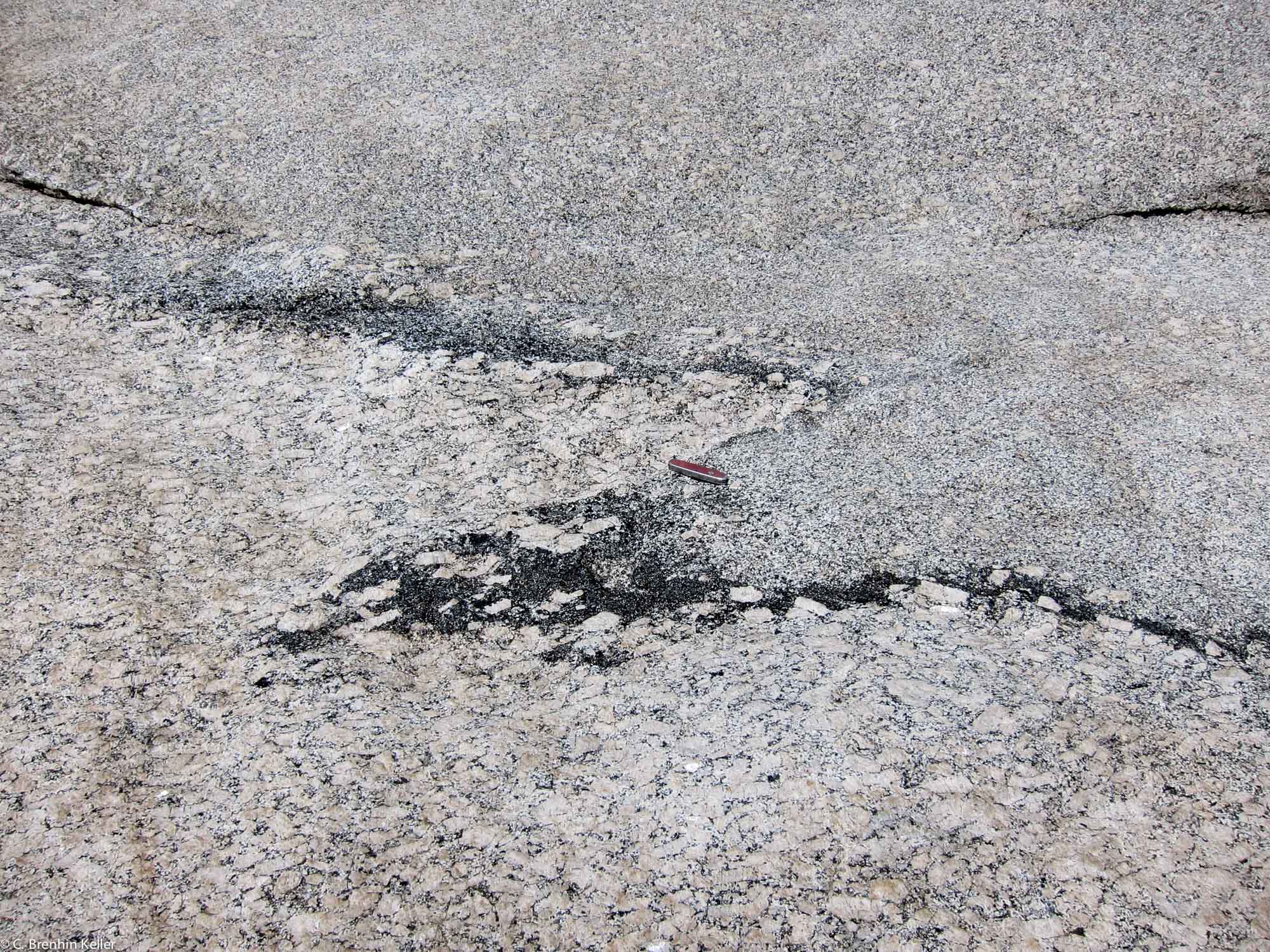 A large mafic enclave cut and offset by an aplite dike, Sciora region