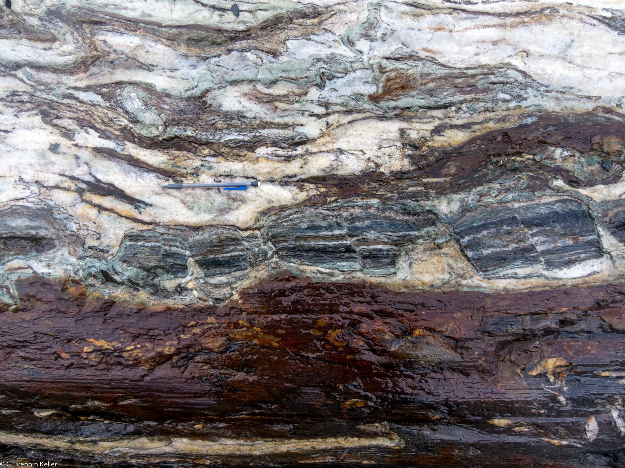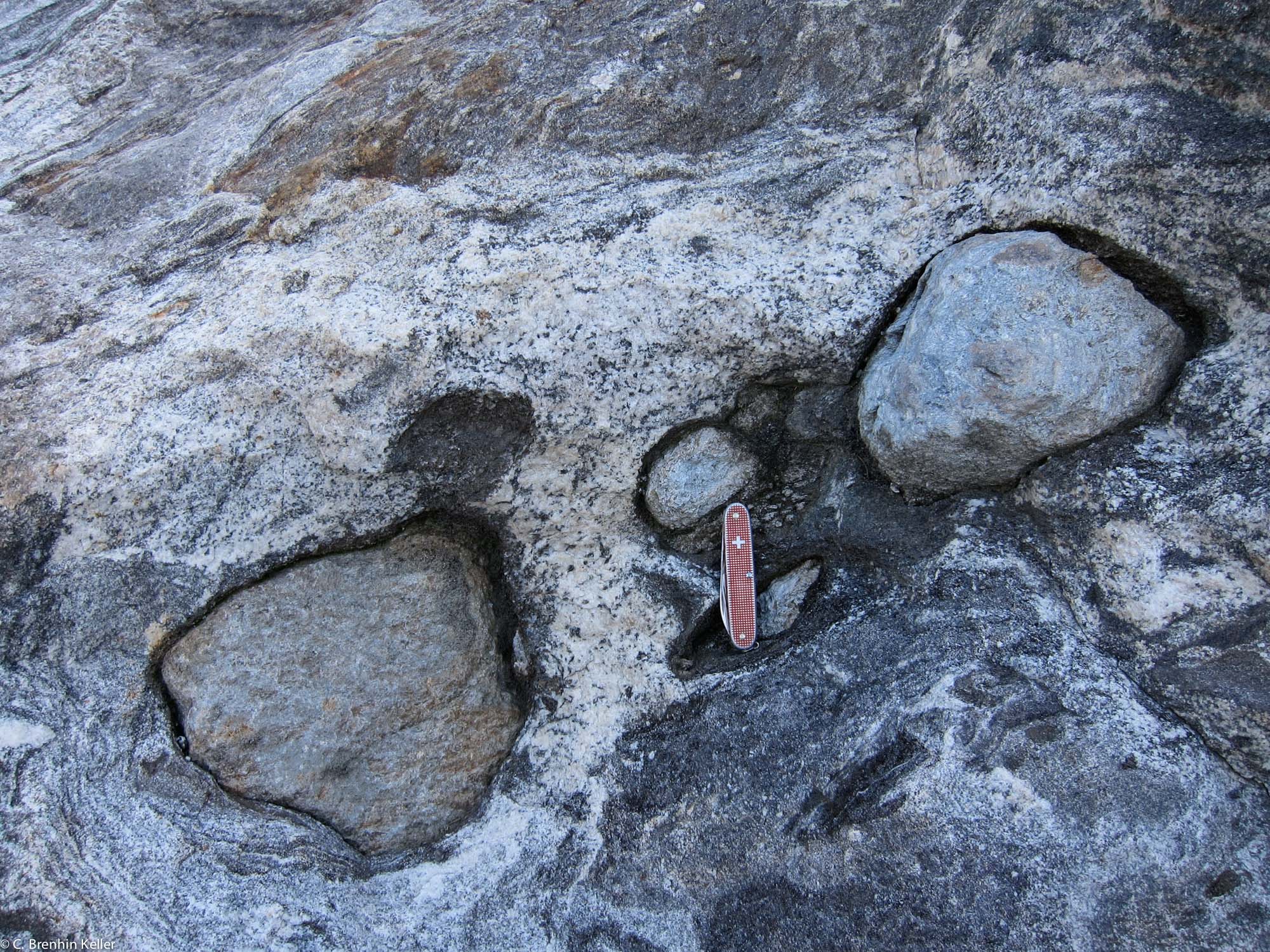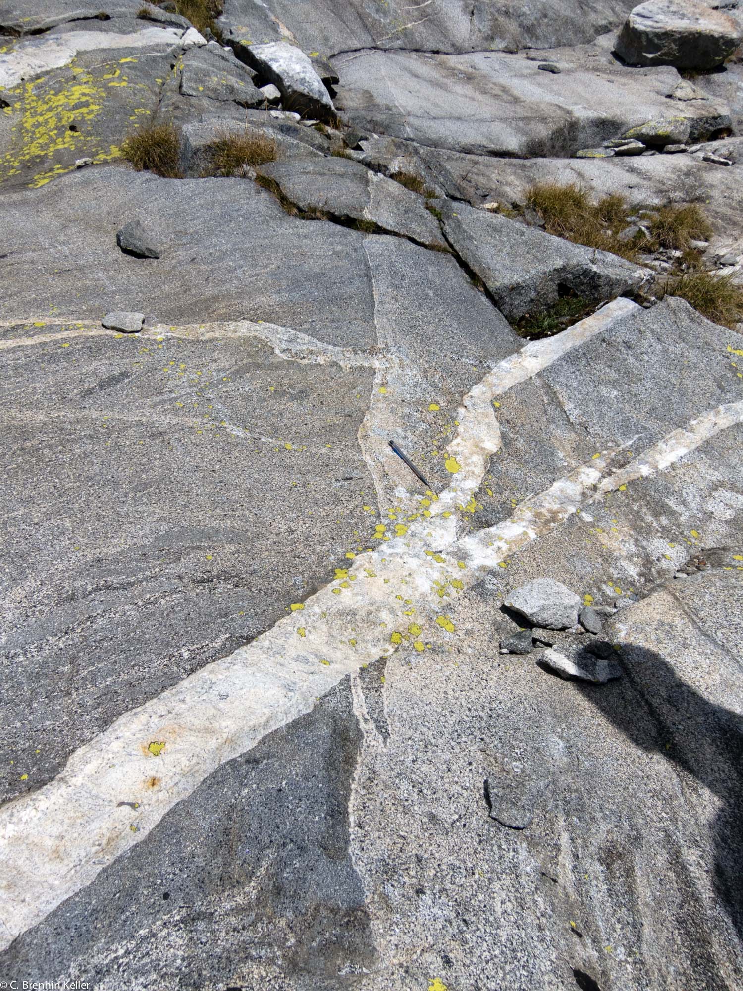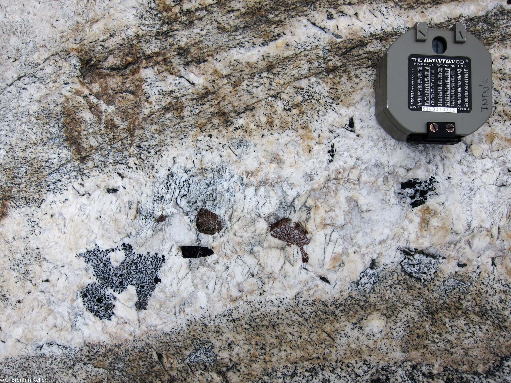 A large mafic enclave cut and offset by an aplite dike, Sciora region