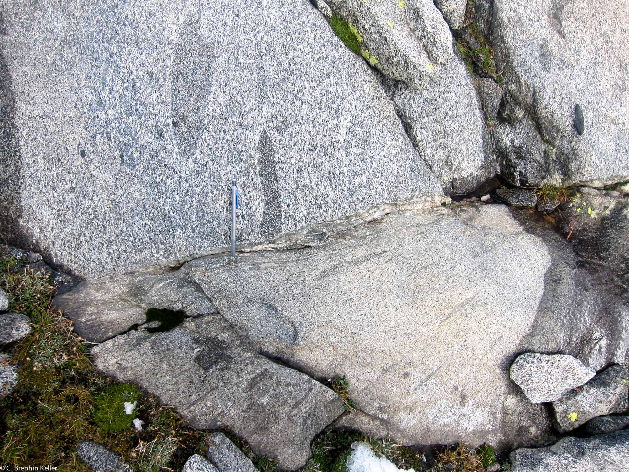 An aplite “schlieren-dike” offset across a magmatic shear zone in the transitional “übergangszone” facies of the Bergell pluton, Sciora region