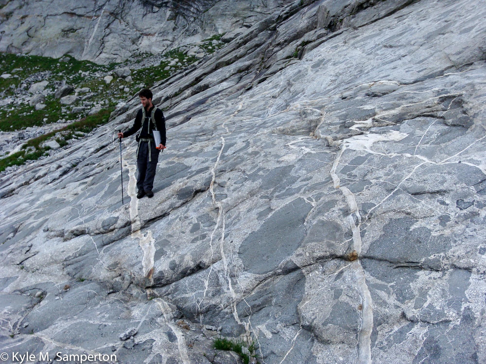 Large aplite dike, Gianetti region. One of many striking roughly ~240 throughout the Bergell pluton. Kyle Samperton for scale.