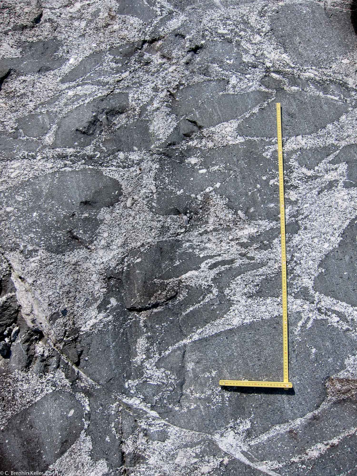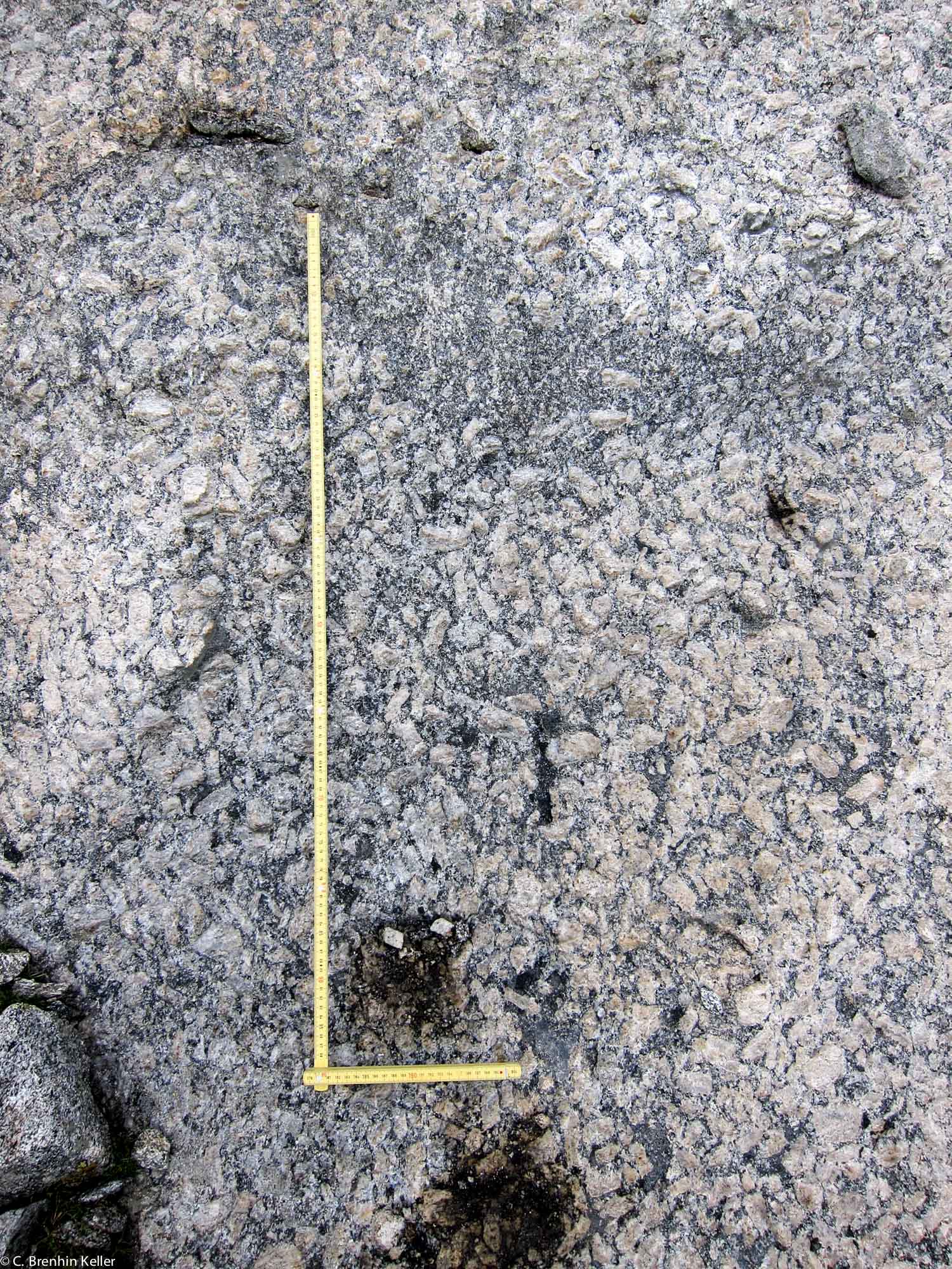 Dense K-feldspar megacryst clot with biotite-rich interstices, Gianetti region. Ruler is set to 1m for scale.