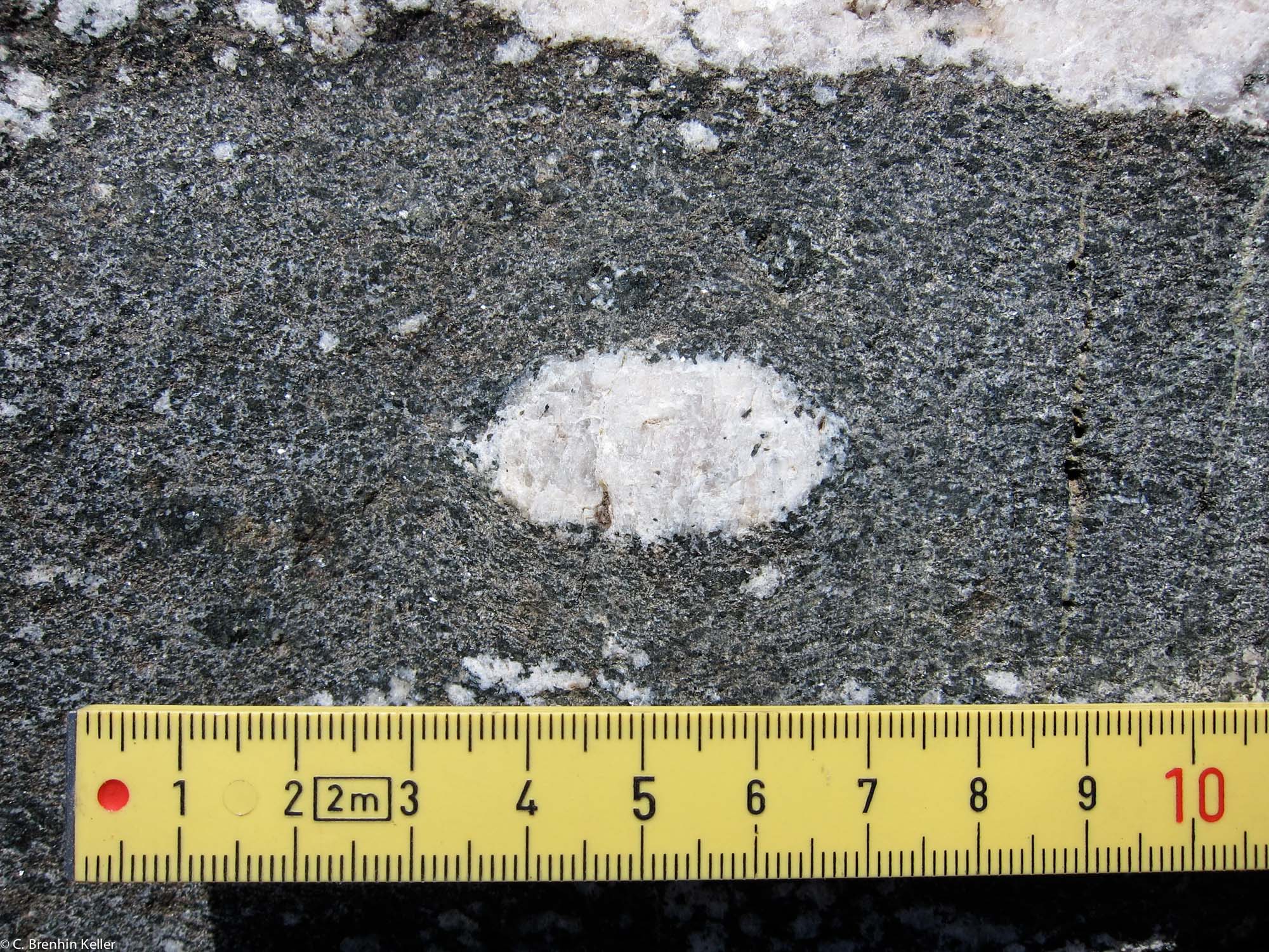 Calc-silicate boudin in marble country rock near the roof of the Bergell pluton, Ponti region