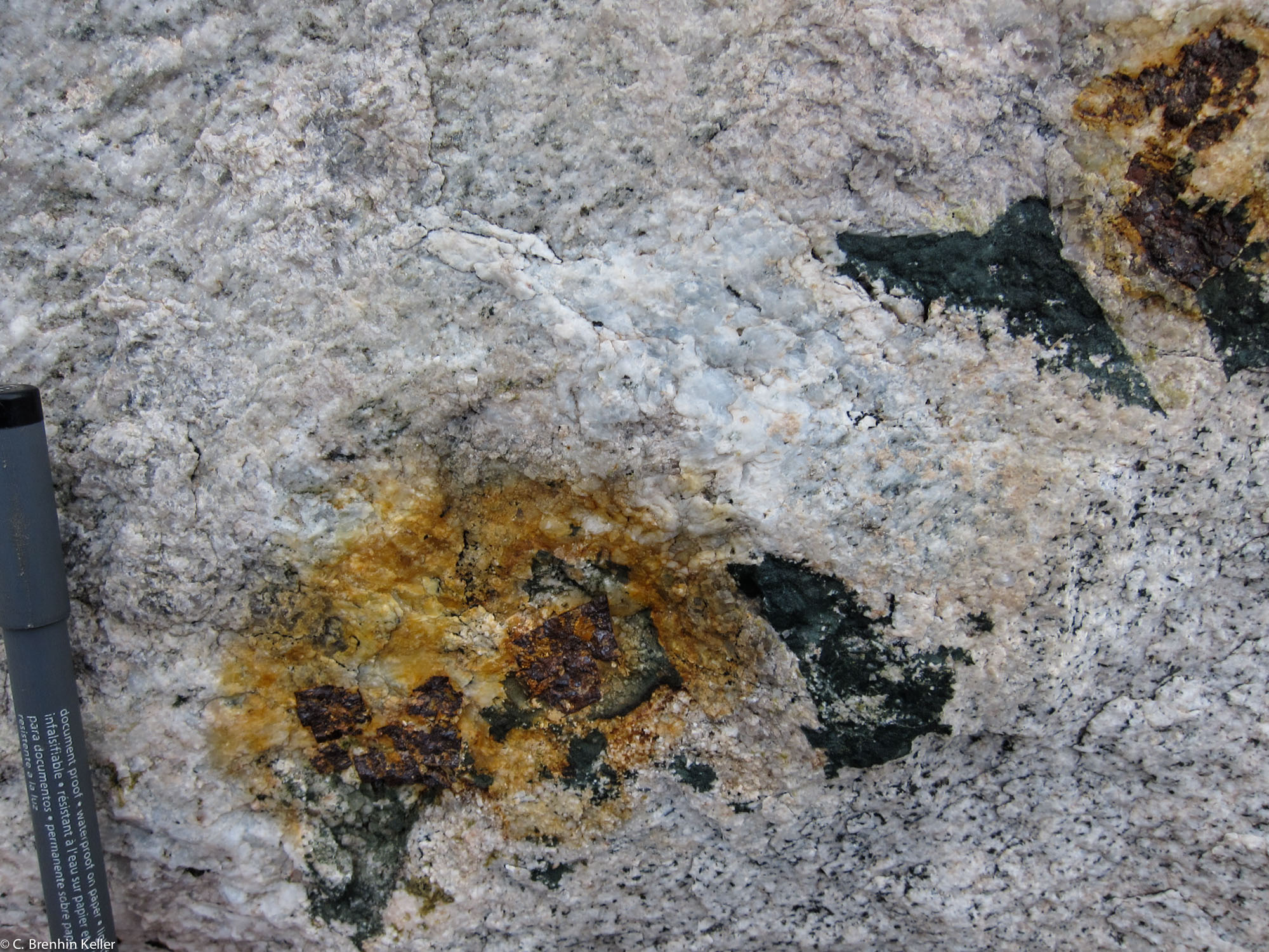 Recently deglaciated exposure is sufficiently fresh that oxidation of exposed pyrite is still ongoing.