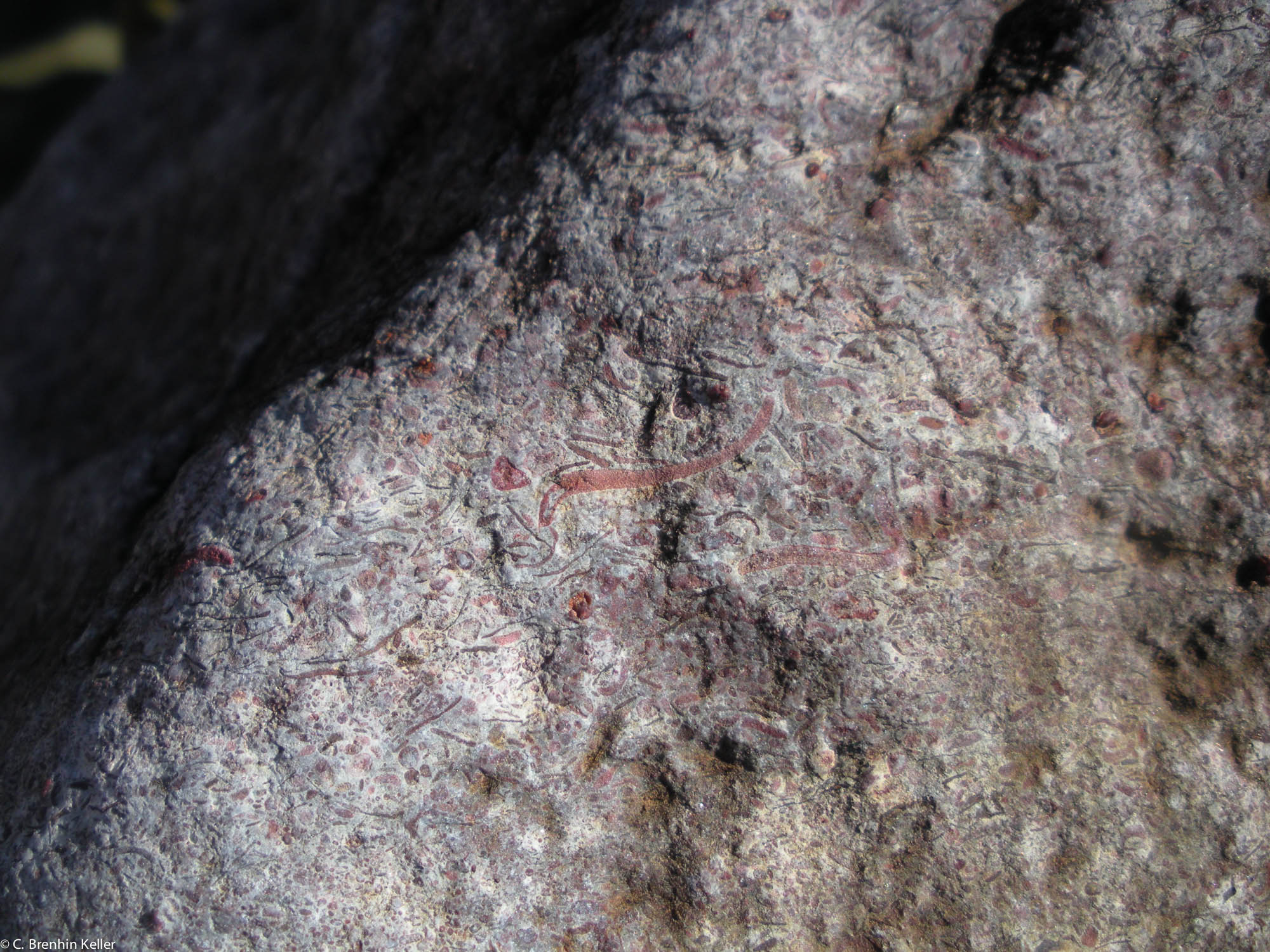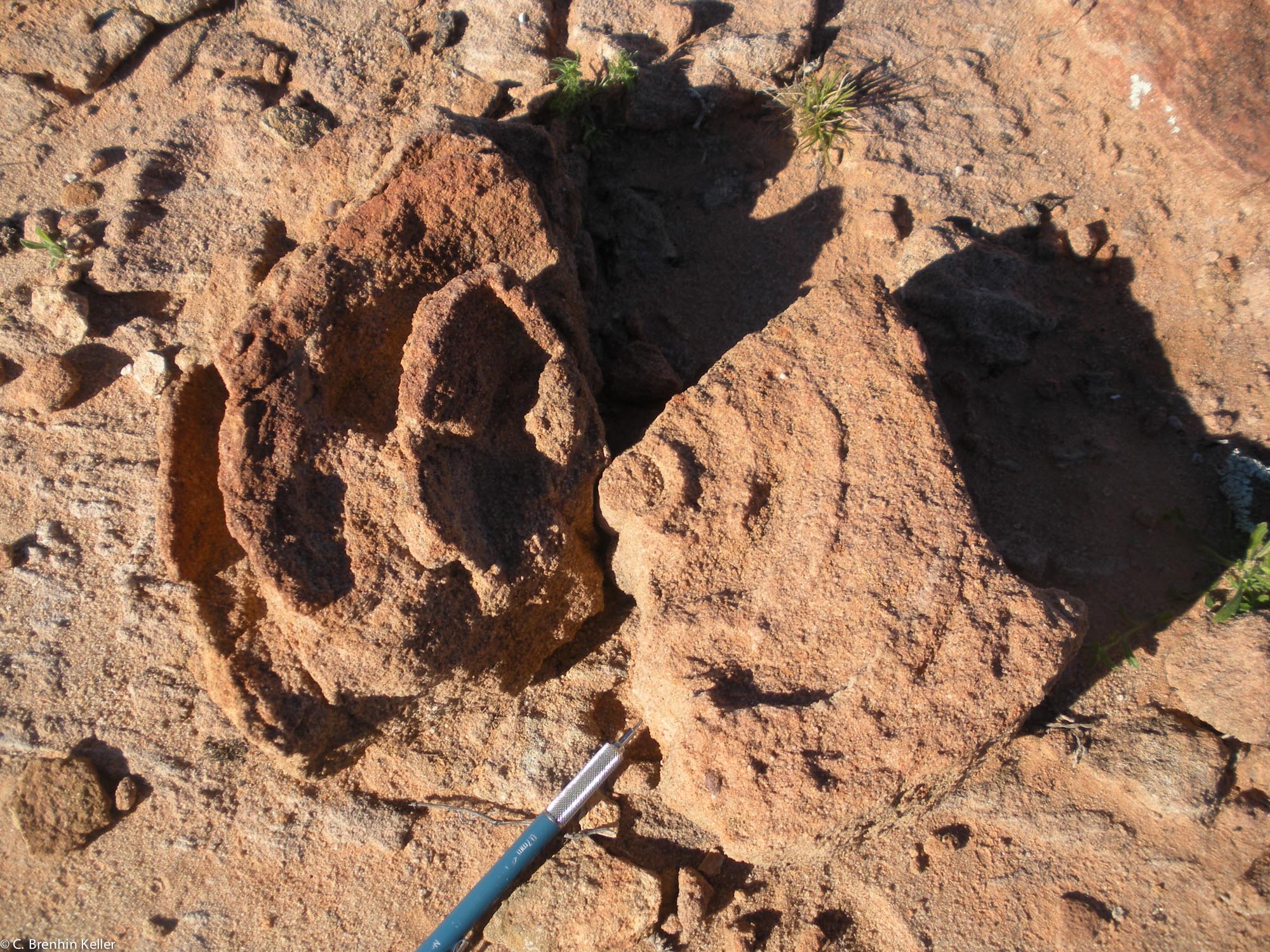 A contender for the title of oldest animal body fossil, according to Maloof et al. 2010. These possible ~640 Ma demosponges are seen here in the upper Trezona formation just below the Marinoan diamictites of the Elatina formation and the Nuccalena cap carbonate in Elatina Creek, Flinders Range, South Australia. Field of view is approximately 15 cm.